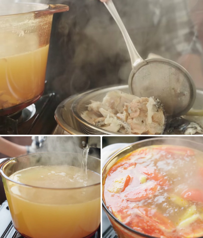 Cho vào nồi, sau khi nấu cá khoảng 4-5 phút, lấy cả đầu và xương cá cho vào tô. Sau đó lọc nước dùng qua chao để làm trong, thêm 1 lít nước sôi vào nồi và tiếp tục nấu ở lửa nhỏ. Sau đó cho vào nước dùng 1 thìa muối, 2,5 thìa gia vị, 2,5 thìa đường, 1/2 thìa bột ngọt, 1,5 thìa nước mắm và 1 thìa dầu hạt điều. Bạn có thể điều chỉnh gia vị tùy theo khẩu vị của mình. Cuối cùng cho dứa và cà chua đã xào vào nồi, đun trên lửa nhỏ khoảng 10 phút rồi tắt bếp.