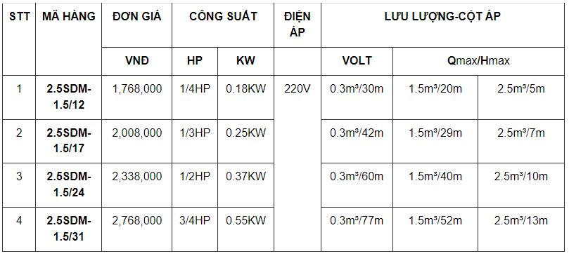 Máy bơm chìm hoả tiễn 2.5SDM cánh 1.5 dùng để cấp nước từ giếng hoặc hồ chứa, được sử dụng trong gia đình, trong các khu công nghiệp, tưới vườn và thủy lợi.