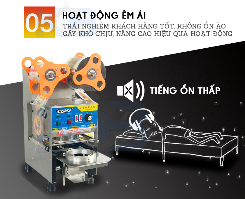 Máy dán miệng cốc với công suất cao dễ vận hành, không gây ồn ảnh hưởng tới không khí của quán. Bạn có thể dùng máy trong thời gian dài mà hoàn toàn không hề ảnh hưởng đến các bộ phận bên trong.