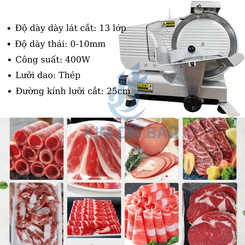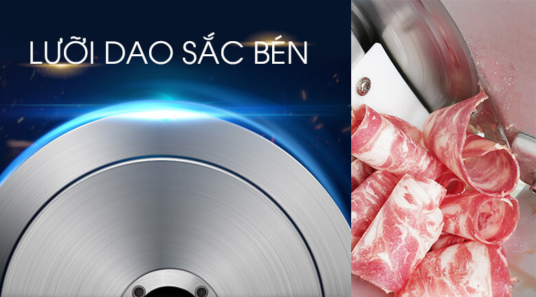 - Lưỡi dao có đường kính 25cm được làm từ thép cứng - cao cấp - đảm bảo sự sắc bén và lâu dài, sắc bén thái lát giúp miếng thịt rất gọn. Dao có độ dày mỏng từ 0mm-10mm. Lưỡi dao đảm bảo được sự sắc bén cao và dùng lâu bền, bề mặt thịt lát thịt mịn không bị nát vụn như thái bằng tay.