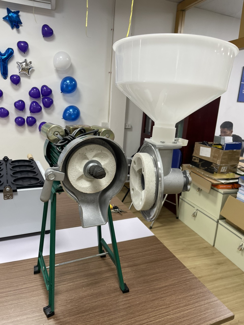 Cách nghiền: Mở cho máy chạy ổn định khoảng 10 giây và có tiếng kẹt kẹt nhỏ là 2 viên đá đã cọ sát nhau phù hợp. Mở van cấp nước cho chảy vào phễu nhỏ đều, đóng gạt phễu cho gạo đã ngâm vào và mở gạt từ từ, nghe tiếng máy êm là được.